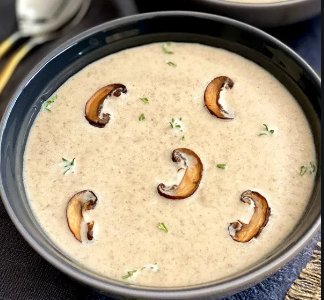 Mushrooms, a type of fungi that has a unique savoury taste, when cooked, have a dense and meaty texture which makes it a close vegetarian substitute for a lot of meat dishes. The cream of mushroom soup is rich and creamy, with tender bites of sliced mushrooms. As this is a base for a lot of other recipes, you can make it in bulk and use in casseroles or simply have it as soup.