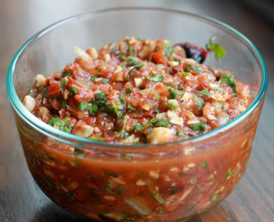 - Combine chopped onions and garlic with chopped tomatoes, jalapeno peppers, coriander leaves, tomato ketchup, tabasco sauce and lermon juice. Add salt and black pepper to taste.